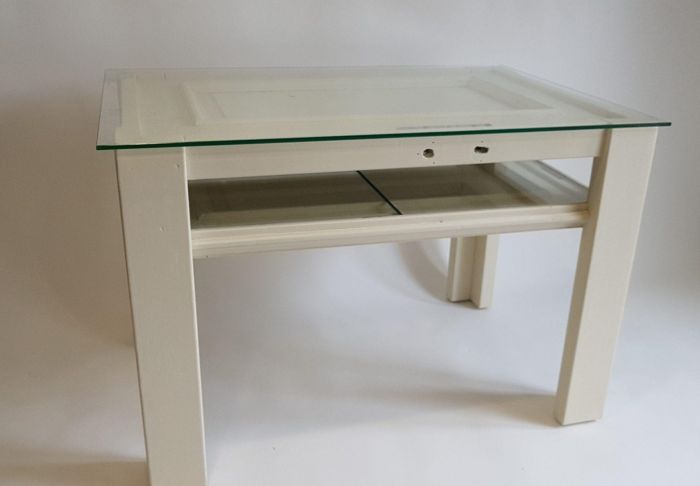 Der Massivholztisch ist aus historischen Rahmen/Füllungstüren gefertigt. Als Ablage und Tischplatte wurde eine Float Glas 8mm aufgelegt.