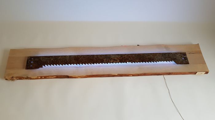 Als Unterlage dient eine sägeraue unbesäumte Kiefern-Bohle. Das Sägeblatt ist mit Abstand montiert zur Aufnahme der LED RGB Lichtleiste. Die Kabellänge beträgt 120cm.