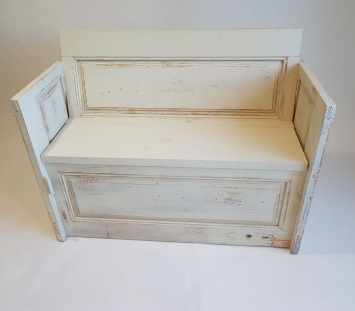 Diese Sitztruhe ist aus einer historischen Rahmen/Füllungstür gefertigt. Die Rückenlehne wurde leicht angeschrägt.