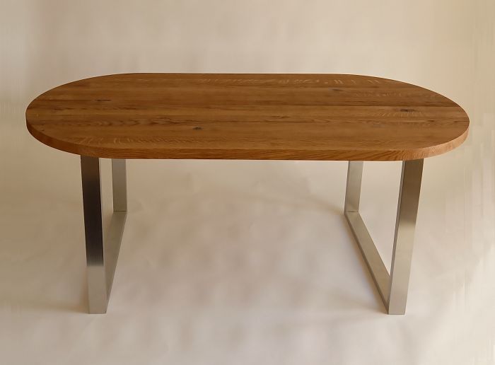 Der Esstisch ist in rustikaler Optik aus Eichenholz verleimt. Die Platte liegt auf kastenförmigen Kufen aus Edelstahl auf.