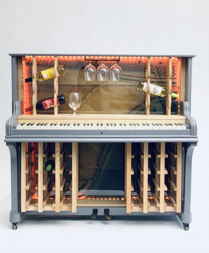 Die Bar ist aus einem alten Klavier hergestellt. Ablage / Flaschen und Glashalter aus Sipo-Mahagoni.