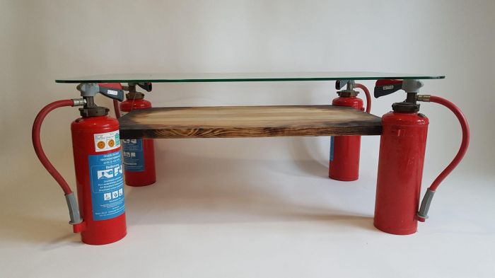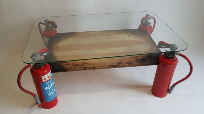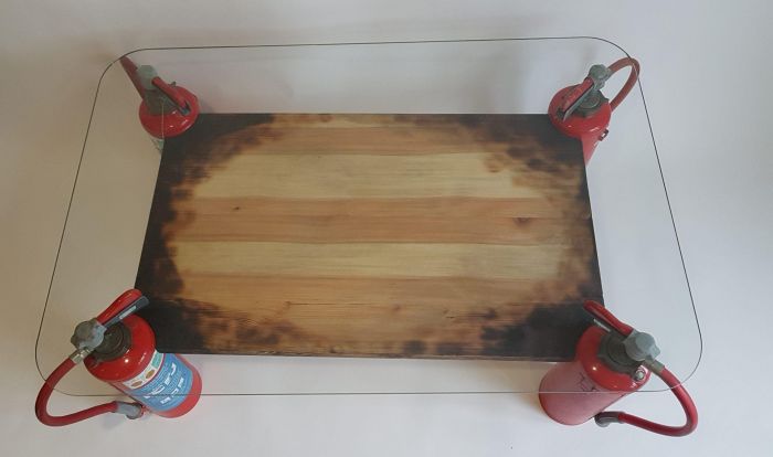 Der Couchtisch ist gefertigt aus vier gleichen Bundeswehrfeuerlöscher die als Standfüße dienen. Die Ablageplatte besteht aus Kiefer-Leimholz und wurde geflammt und danach geölt. Als Tischplatte ist eine Float Glas 8mm aufgelegt.