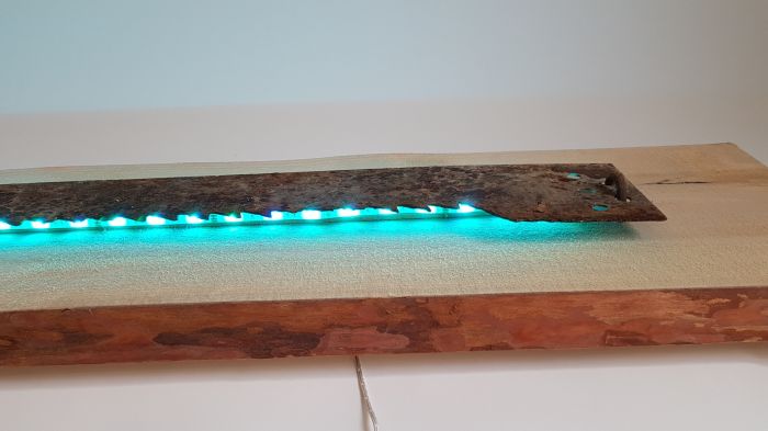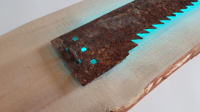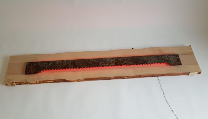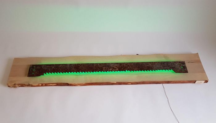 Als Unterlage dient eine sägeraue unbesäumte Kiefern-Bohle. Das Sägeblatt ist mit Abstand montiert zur Aufnahme der LED RGB Lichtleiste.