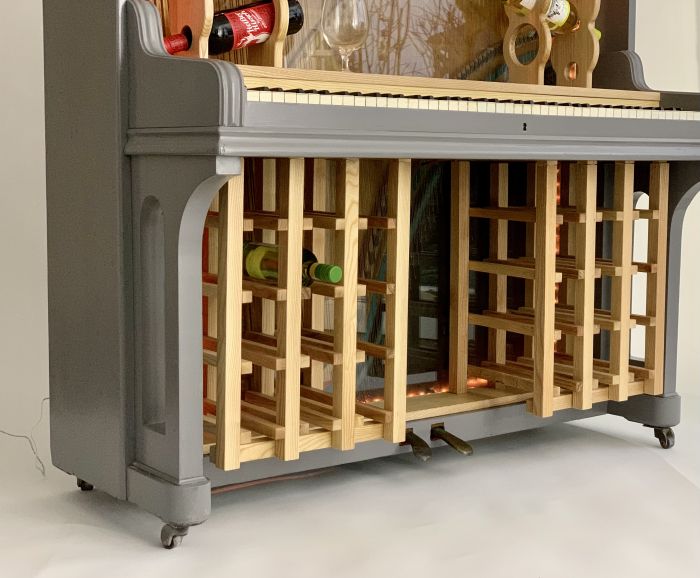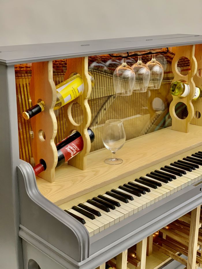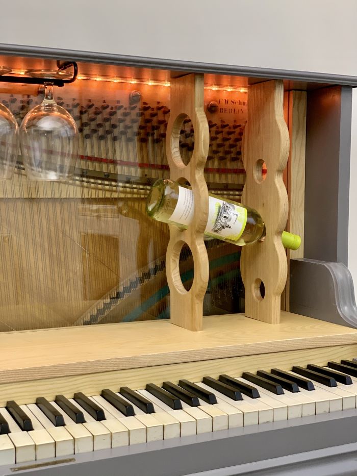 Dieses schöne Wein-Klavier hat Platz für 30 Flaschen. Die Weinflaschenhalter sind aus Eschenholz gefertigt. In der Mitte können die Gläser eingehängt werden. Die Klavierseiten wurden hinter Glas mit LED beleuchtet.