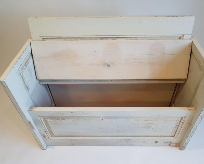 Diese Sitztruhe ist aus einer historischen Rahmen/Füllungstür gefertigt.